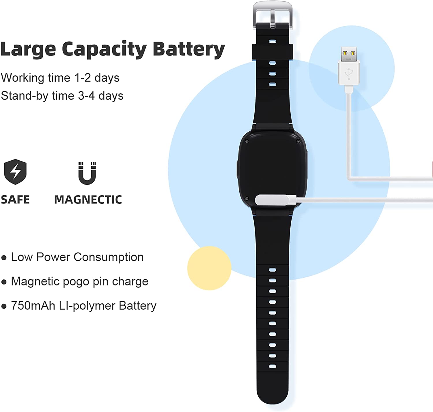 【Long Use Time & Waterproof】Adopting the world's leading battery technology, the capacity is increased to 600mAh with constant volume and security. The battery endurance has been significantly improved. The smartwatch strap for kids is made of soft silicone, it is durable and comfortable to wear. IP67 waterproof, children can play freely outdoors on rainy days